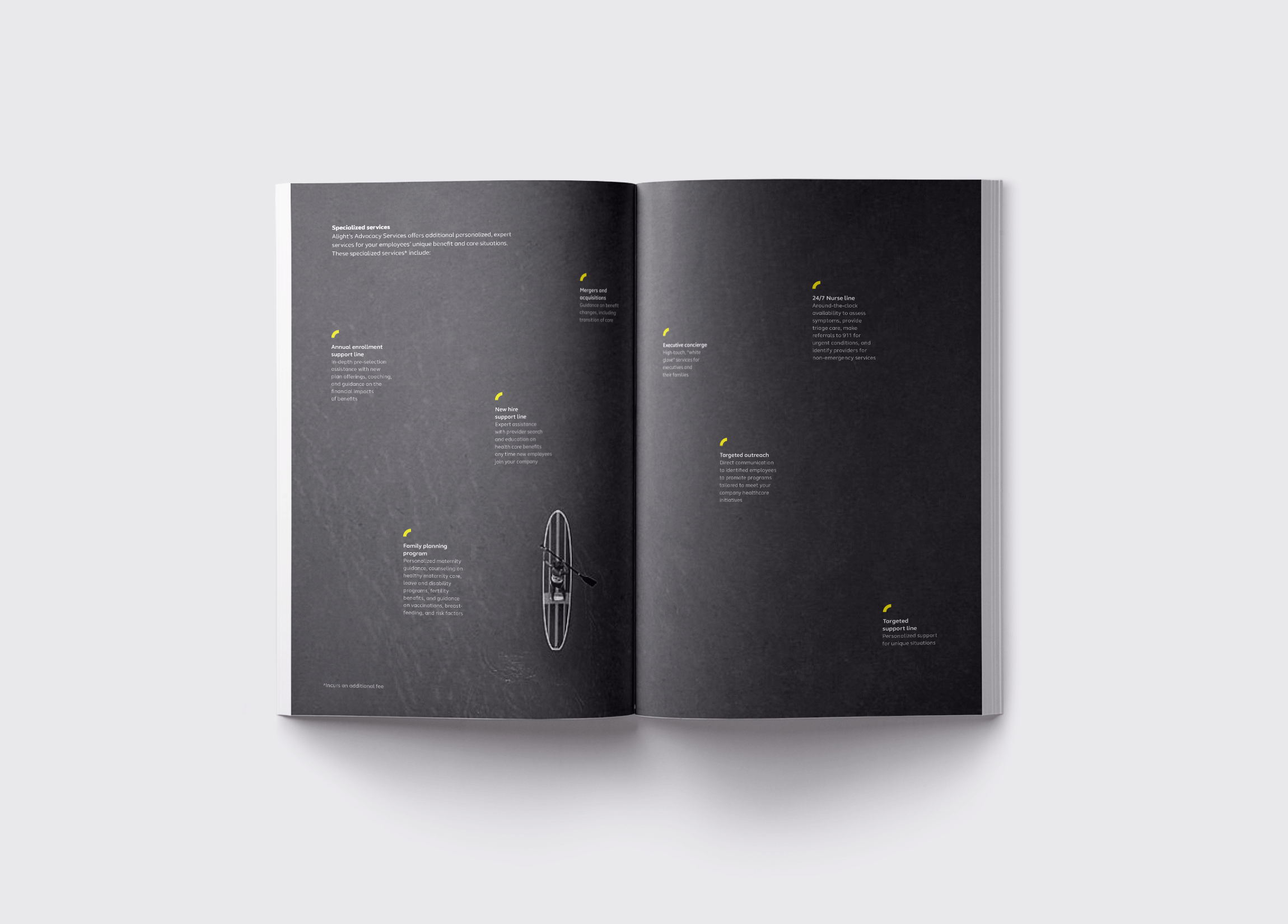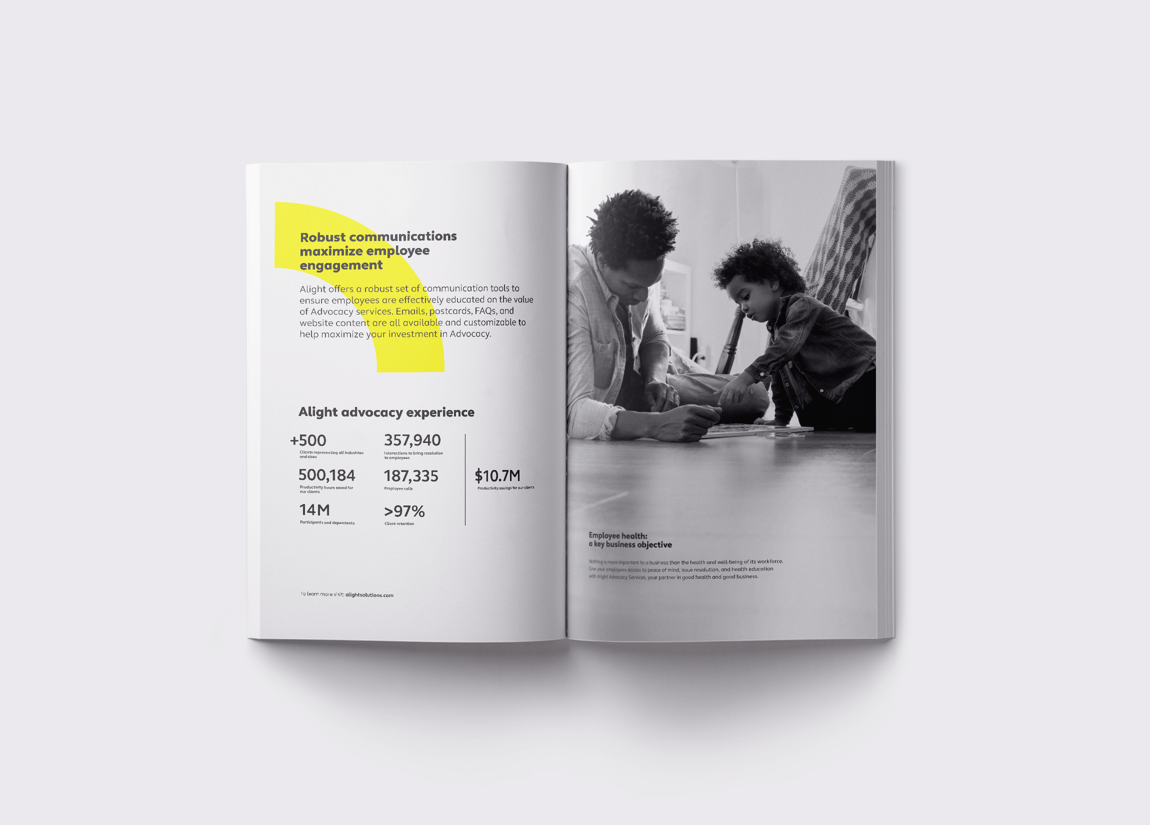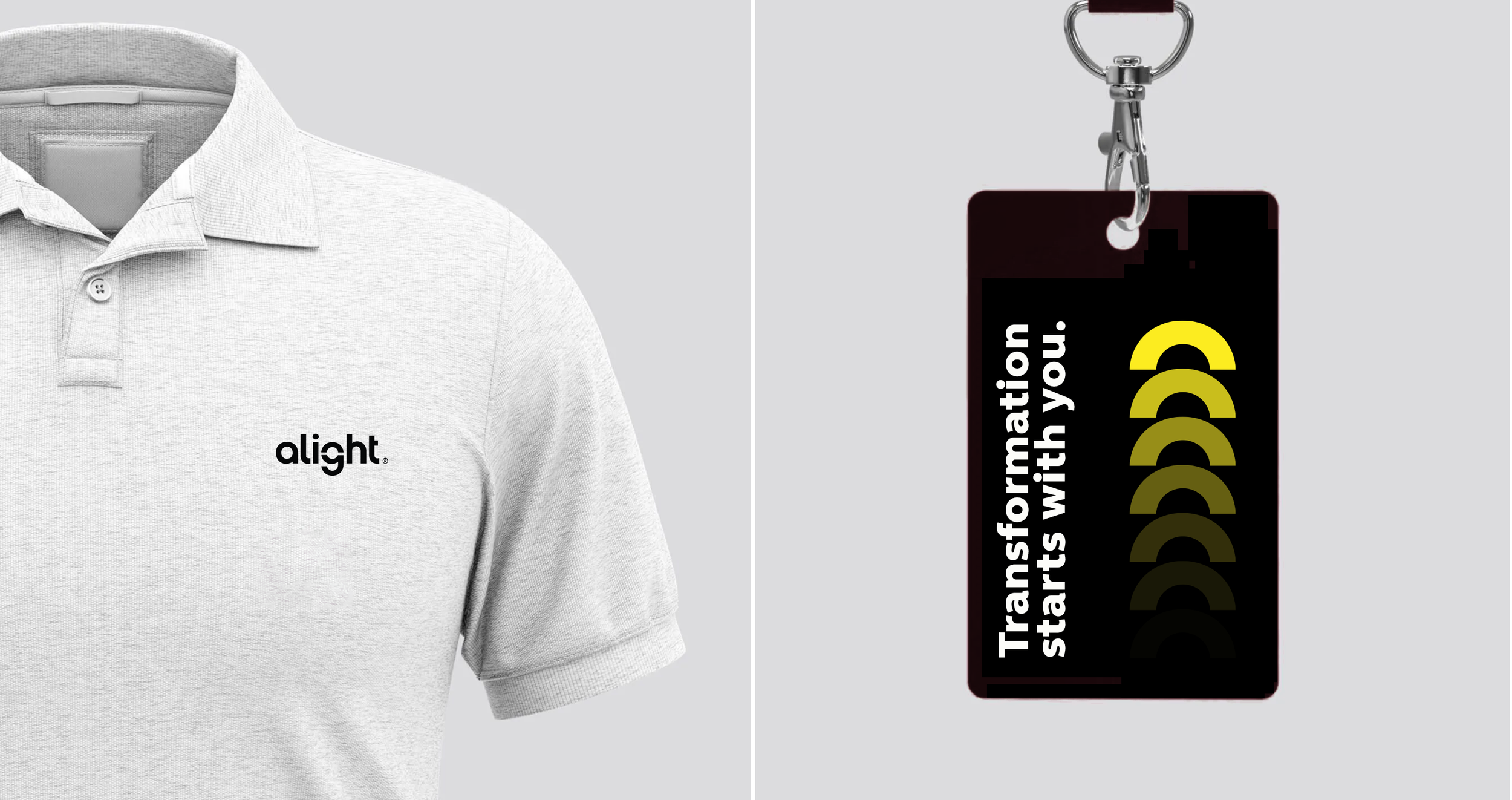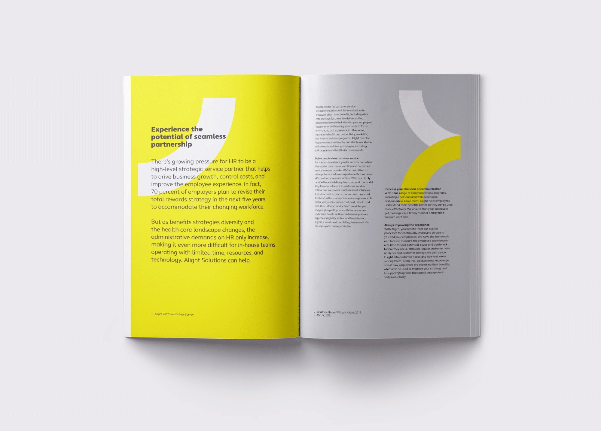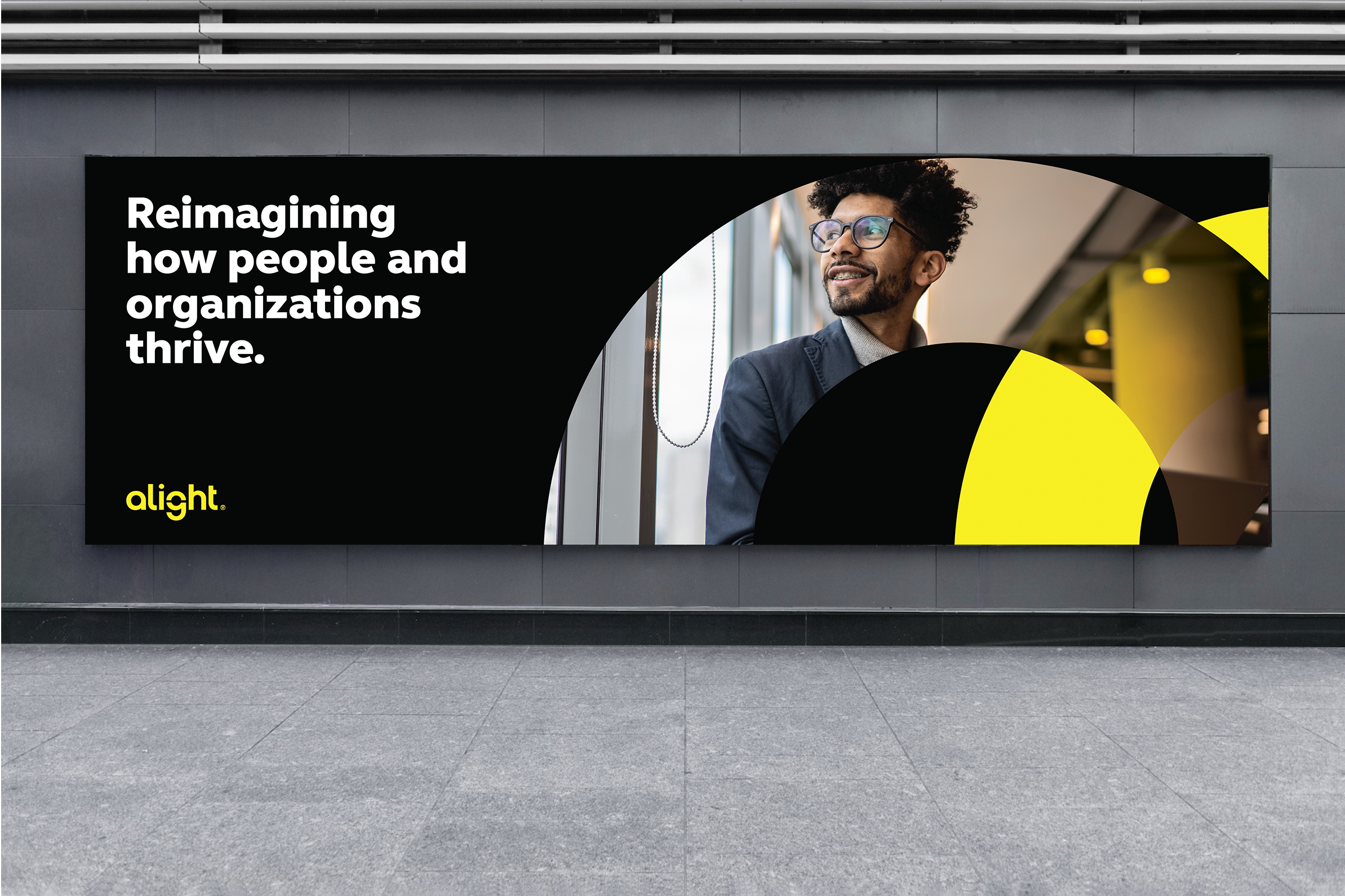 To drive home that theme—and generate awareness and engagement among their internal teams—we developed a series of communications using circular patterns to connote movement and possibility. The use of the bright yellow creates energy and connotes clarity, giving the campaign a forward outlook and positive energy that are refreshing and somewhat unexpected in a b2b brand. Dynamic and evolving, Alight Solution is on a mission to help companies realize their fullest potential.
