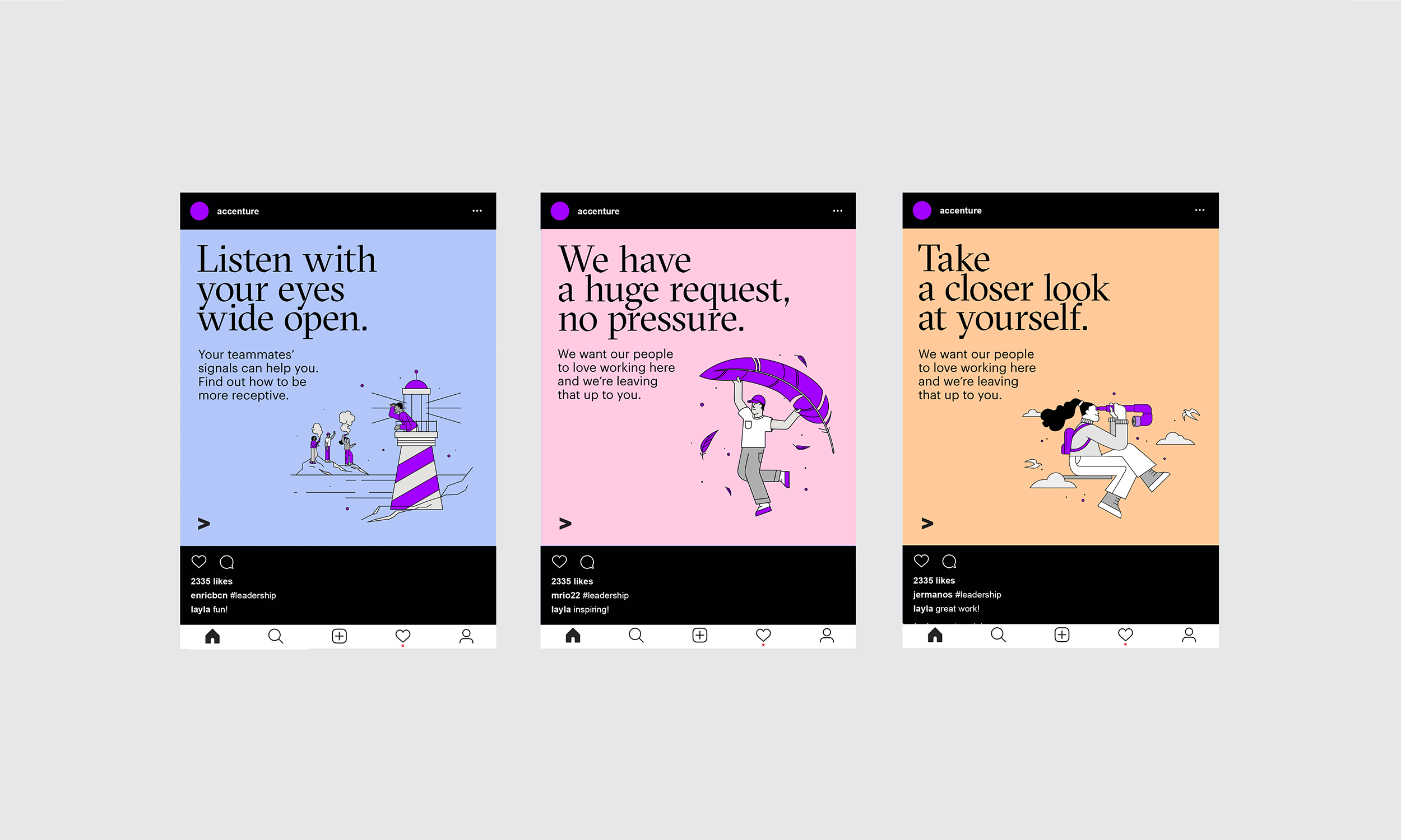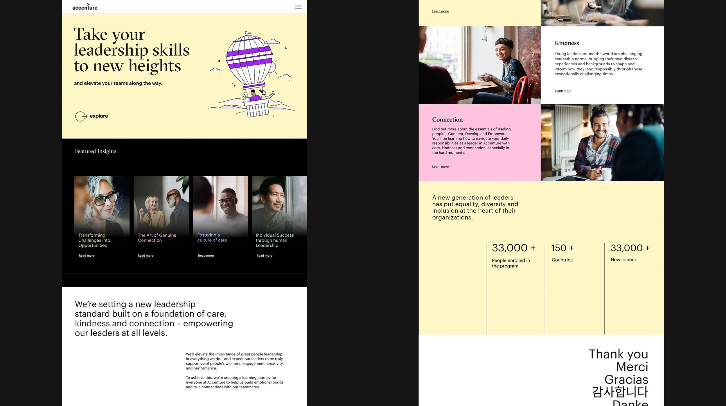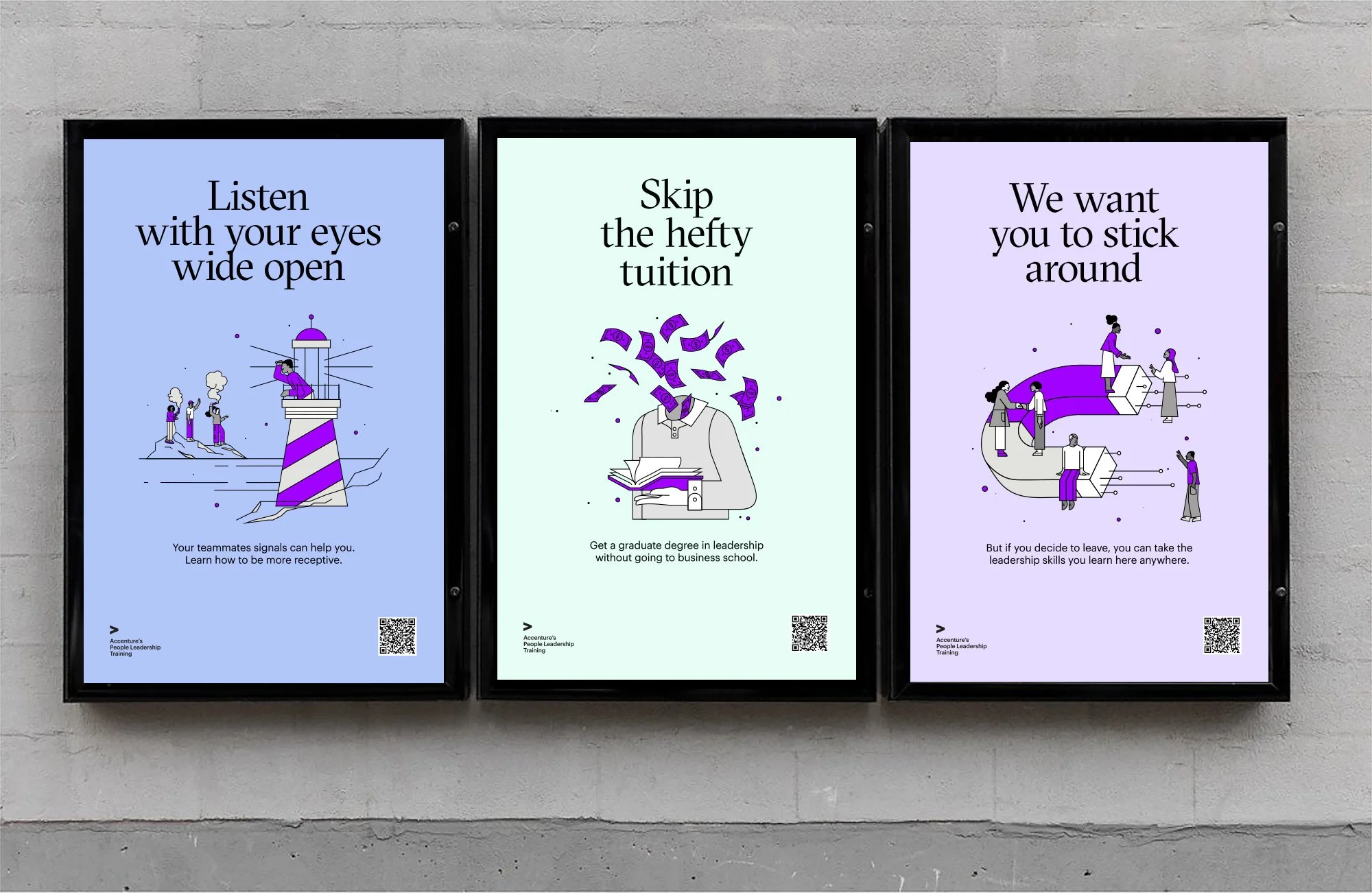 This global campaign marked a rethinking of leadership at Accenture—a cultural shift in the company with a focus on the people aspects of leadership: values like caring, kindness and human connection. The initiative offers a credentialing program with coursework and training designed to develop empathetic leadership skills, which Accenture views as critical to advancing the company’s mission and values.