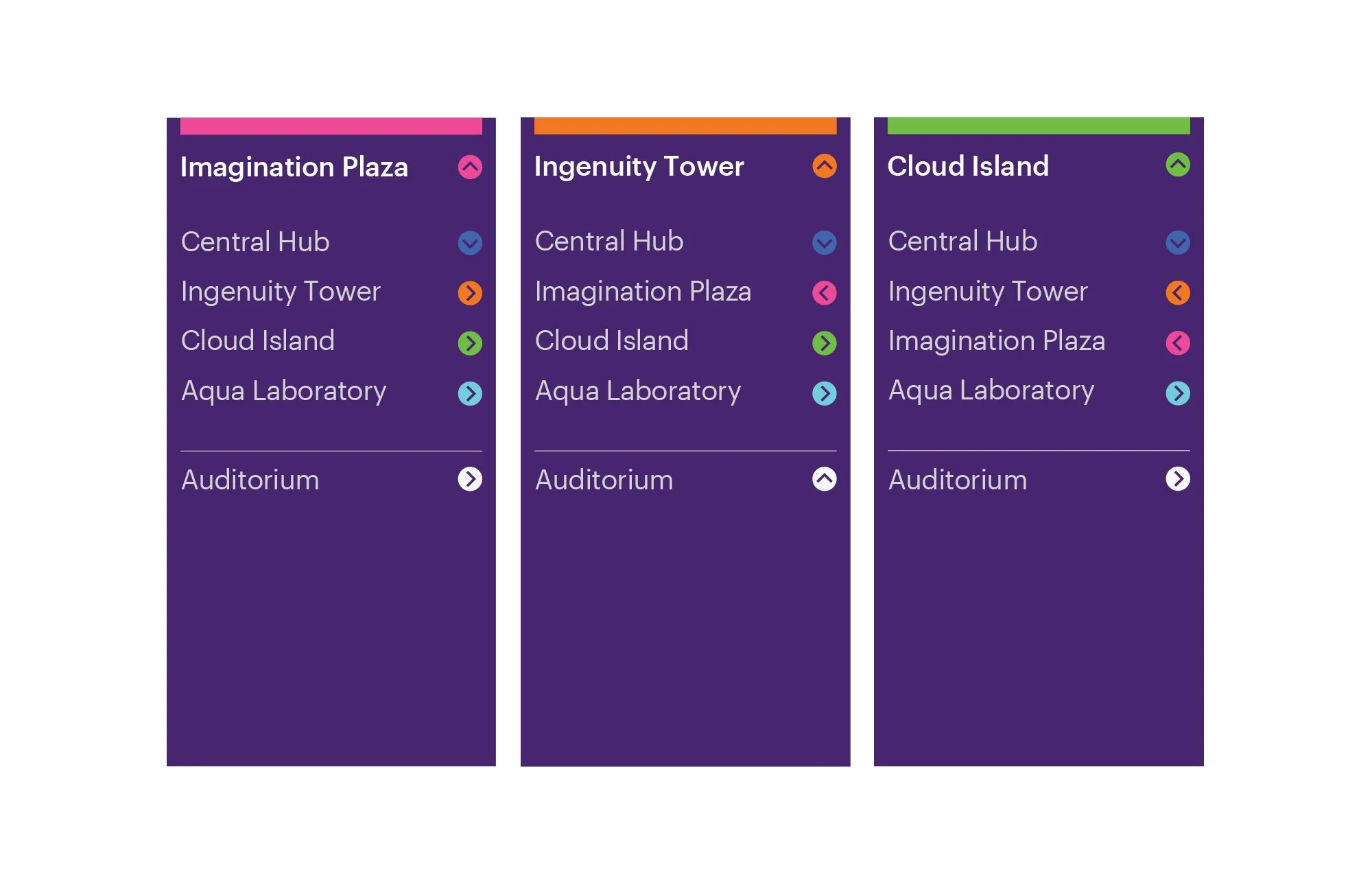 One Accenture Park was also a way to showcase Accenture’s prowess in incorporating leading-edge technology in breakthrough ways. The first year, the program onboarded more than 150,000 new hires, and each year the numbers have steadily increased. Wayfinding signage provides directions to different virtual rooms, where new employees can learn about aspects of the company and its offerings. The environmental graphics created the impression of an environment with infinite potential.